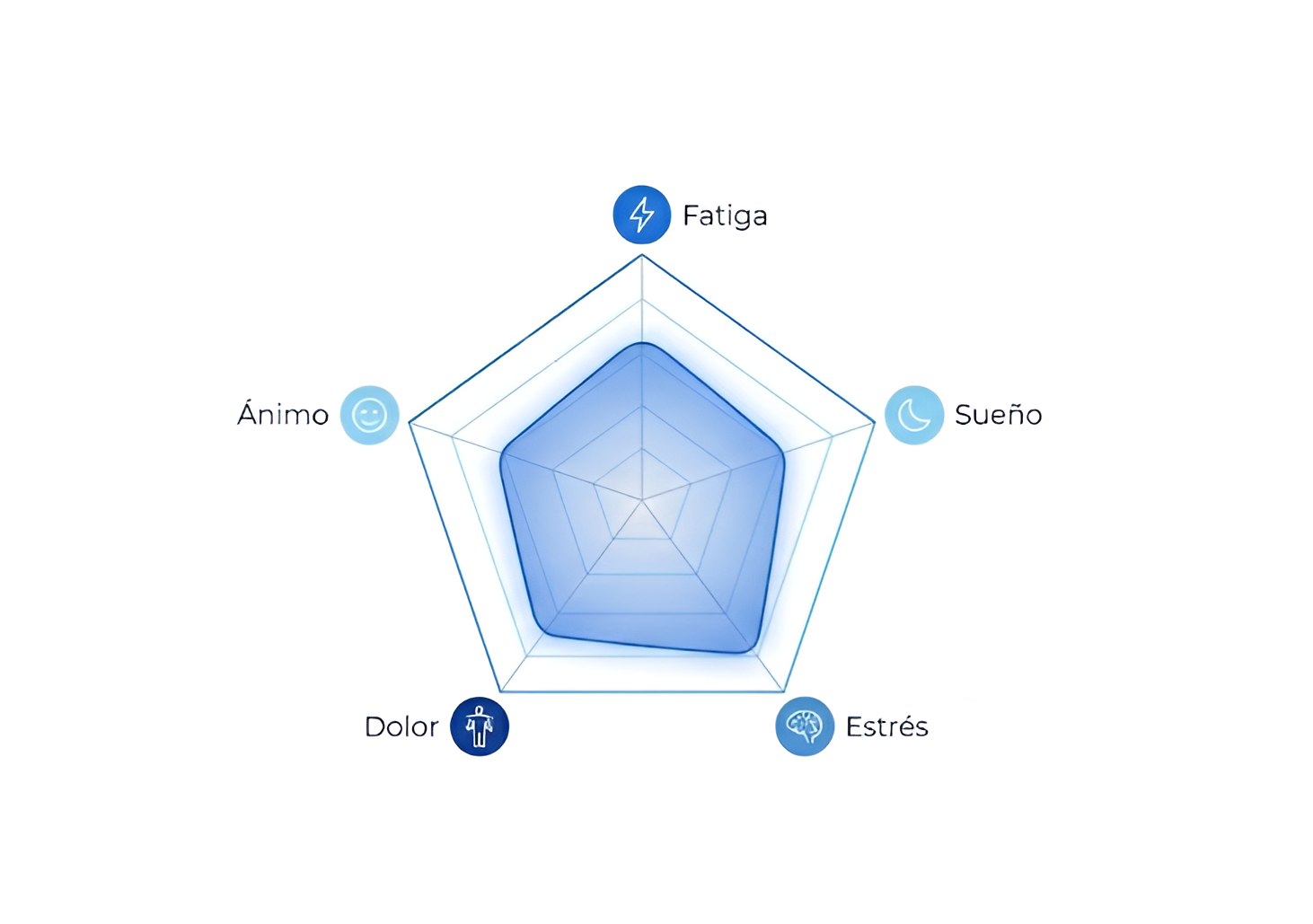 Cuestionarios diarios integrados: Fatiga, Estrés, Dolor muscular y Calidad percibida.